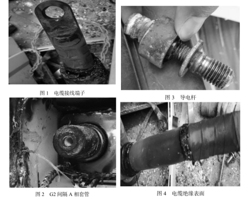 搶修人員對(duì)G2間隔電纜拆除后,發(fā)現(xiàn)電纜接線端子(如圖1所示)氧化嚴(yán)重,說(shuō)明此處遭受過(guò)高溫侵蝕,并且應(yīng)力錐靠近端子處的燒蝕痕跡也說(shuō)明了插頭受高溫侵蝕;現(xiàn)場(chǎng)發(fā)現(xiàn)端子與環(huán)氧套管銅件的接觸面存在明顯氧化,說(shuō)明高溫侵蝕時(shí),端子與環(huán)氧套管銅件表面并未完全緊密貼合;檢查套管內(nèi)部螺紋亮光正常(如圖2所示),說(shuō)明導(dǎo)電桿安裝緊固。環(huán)氧套管遭受高溫痕跡明顯,且銅件表面與端子接觸面也有很明顯氧化痕跡,說(shuō)明在高溫發(fā)生時(shí),端子與環(huán)氧套管銅件表面并未完全緊密貼合;現(xiàn)場(chǎng)對(duì)導(dǎo)電桿(如圖3所示)進(jìn)行檢查,發(fā)現(xiàn)變徑螺桿氧化,以及銅嵌件脫離環(huán)氧,熔融附于變徑螺桿上,都說(shuō)明此處經(jīng)受過(guò)高溫傳導(dǎo);對(duì)電纜應(yīng)力錐剝除后,發(fā)現(xiàn)電纜絕緣表面(如圖4所示)無(wú)明顯爬電痕跡,說(shuō)明應(yīng)力體部位未發(fā)生爬電故障,從絕緣受高溫侵蝕和燒蝕判斷,高溫來(lái)自端子部位。