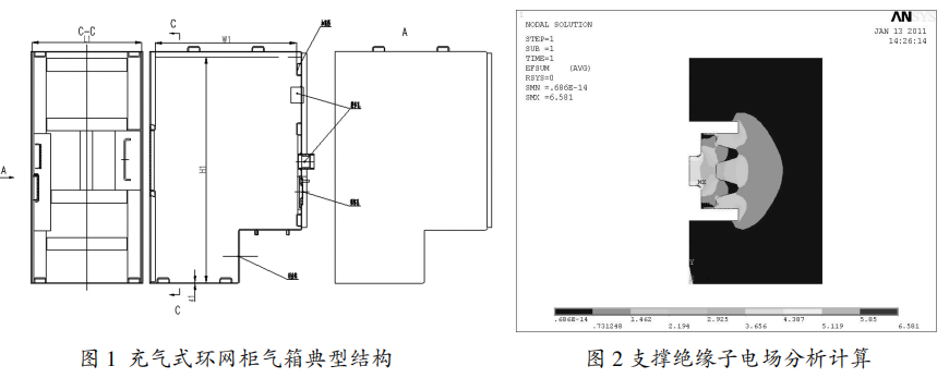 高壓帶電體對地最小空隙處在支撐絕緣子上,通過核算支撐絕緣子的電場如圖2,滿意電場要求,終究確認(rèn)對地最小空隙。根據(jù)最小空隙準(zhǔn)則確認(rèn)氣箱外形尺度(L1xW1xH1)。