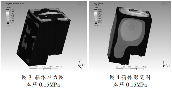 箱壁厚度滿意材料的許應(yīng)應(yīng)力要求及氣箱允許變形量要求。通過軟件剖析核算后得到氣箱的應(yīng)力分布(見圖3)及箱體形變(見圖4),終究找到氣箱壁厚。