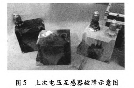 2011年3月30日0:38,35kV垣潔線、35kV垣宏回A、B相電壓互感器擊穿,如圖5所示;2012年3月26日19:7:58,35kV垣潔線56號線路電壓互感器A、B、C相損壞,A、B相有炸裂現(xiàn)象。