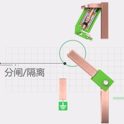 當(dāng)電流開斷終了后,動觸頭釋放樞軸桿,并使其持續(xù)旋轉(zhuǎn)至隔絕方位。在緩沖繃簧的作用下,樞軸桿返回初始方位,然后閉合真空滅弧室。