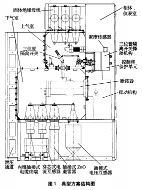 (1)高壓主電路的氣體絕緣技術(shù)和插接技術(shù):對主電路電場進(jìn)行了優(yōu)化,以低壓力SF6氣體作絕緣介質(zhì);開發(fā)了內(nèi)錐、外錐插接式電纜終端頭,插接式固體絕緣母線,選用硅橡膠絕緣的十字聯(lián)接套,端頭T形聯(lián)接套,插接式電壓互感器和避雷器。