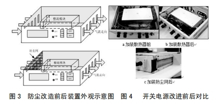 3.2在設(shè)備本體進風(fēng)孔加防塵網(wǎng),避免塵土進入設(shè)備內(nèi)部,設(shè)備維護人員定時對濾網(wǎng)間斷清掃,然后減輕元器件外表覆塵,利于設(shè)備正常散熱,如圖3所示加裝防塵網(wǎng)后開關(guān)電源標明圖。對設(shè)備施行上述改善后,其改善前后對比如圖4所示。