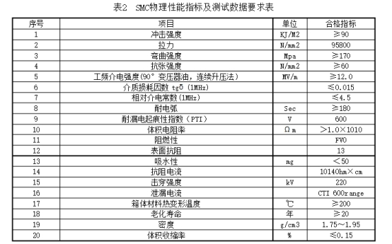 2.3.1分支箱外殼選用S304不銹鋼材料,箱體、門體材料厚度均不該小于2毫米,或SMC復合材料箱體,SMC物理功用方針及測試數(shù)據(jù)滿意表2的要求。
